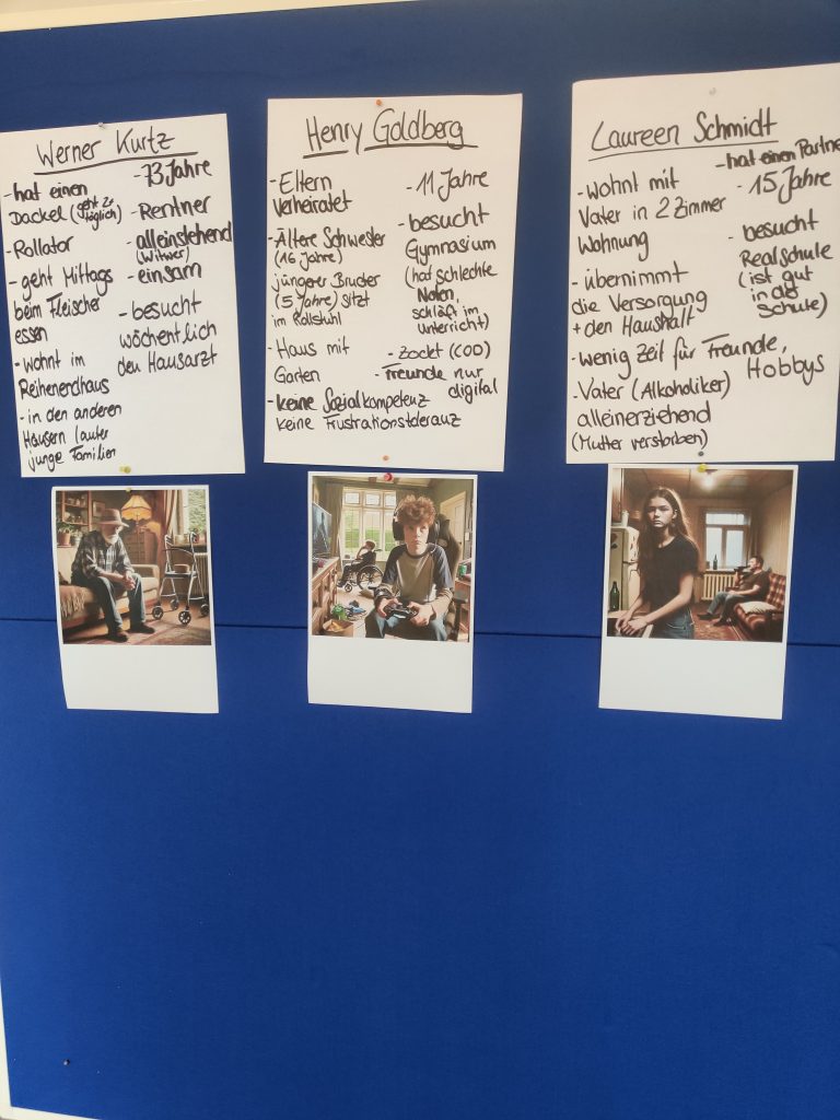 Die ausgewählten Point of Views werden vom Studierenden-Team in einem letzten Schritt veranschaulicht bzw. visualisiert. Dies dient dazu, dass das Studierenden-Team eine gemeinsame Vorstellung von den Menschen (Stakeholdern) entwickelt, deren Probleme bei der Lösung im Vordergrund stehen sollen. Darüber hinaus wird so eine Möglichkeit zur besseren Identifikation mit den jeweiligen Stakeholdern geschaffen, indem ihre Bedürfnisse und Gewohnheiten nachvollziehbar gemacht werden. Im Lehrkontext können die veranschaulichten Nutzerperspektiven auch für Zwischen- oder Abschlusspräsentationen genutzt werden.