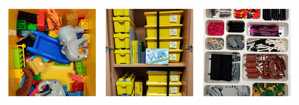 Für die Organisation des Materials gilt: Ein sinnvolles Verhältnis von strukturierter Platzierung (besonders von kleinen Teilen) und dem Bereitstellen von Mischungen verhindert exzessives Suchen, ermöglich aber auch das zufällige Entdecken von interessanten Bausteinen. Außerdem sollten die Kisten mit Bildern versehen sein, die zeigen, was sie beinhalten, um den Abbau der Modelle und das Einsortieren der Teile zu erleichtern.